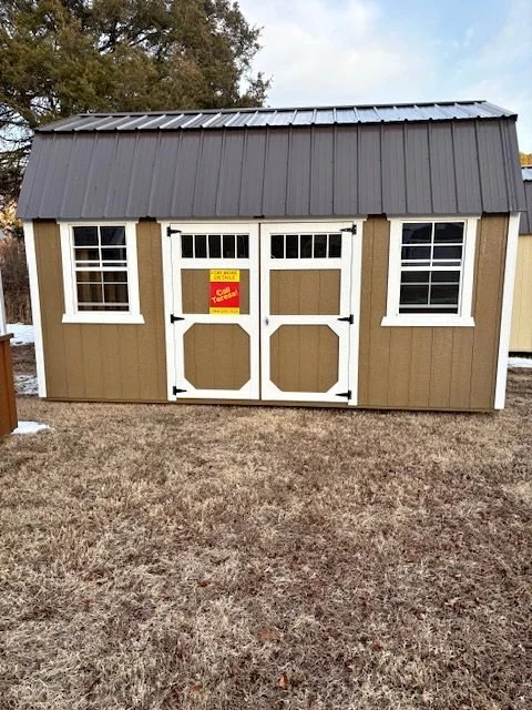Enjoy a nice 15% discount off the brochure price for this beautiful Brown storage shed with Barn White trim and an antique look Burnished Slate Metal Roof. This 10x12 has a screened window on the back wall.